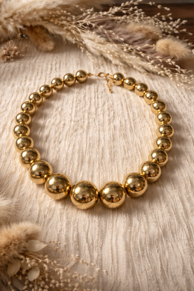 Deze goudkleurige statement ketting met bolletjes is een echte eyecatcher en wordt keer op keer gekozen door onze klanten. Tijdloos, krachtig en perfect om elke outfit direct meer uitstraling te geven.